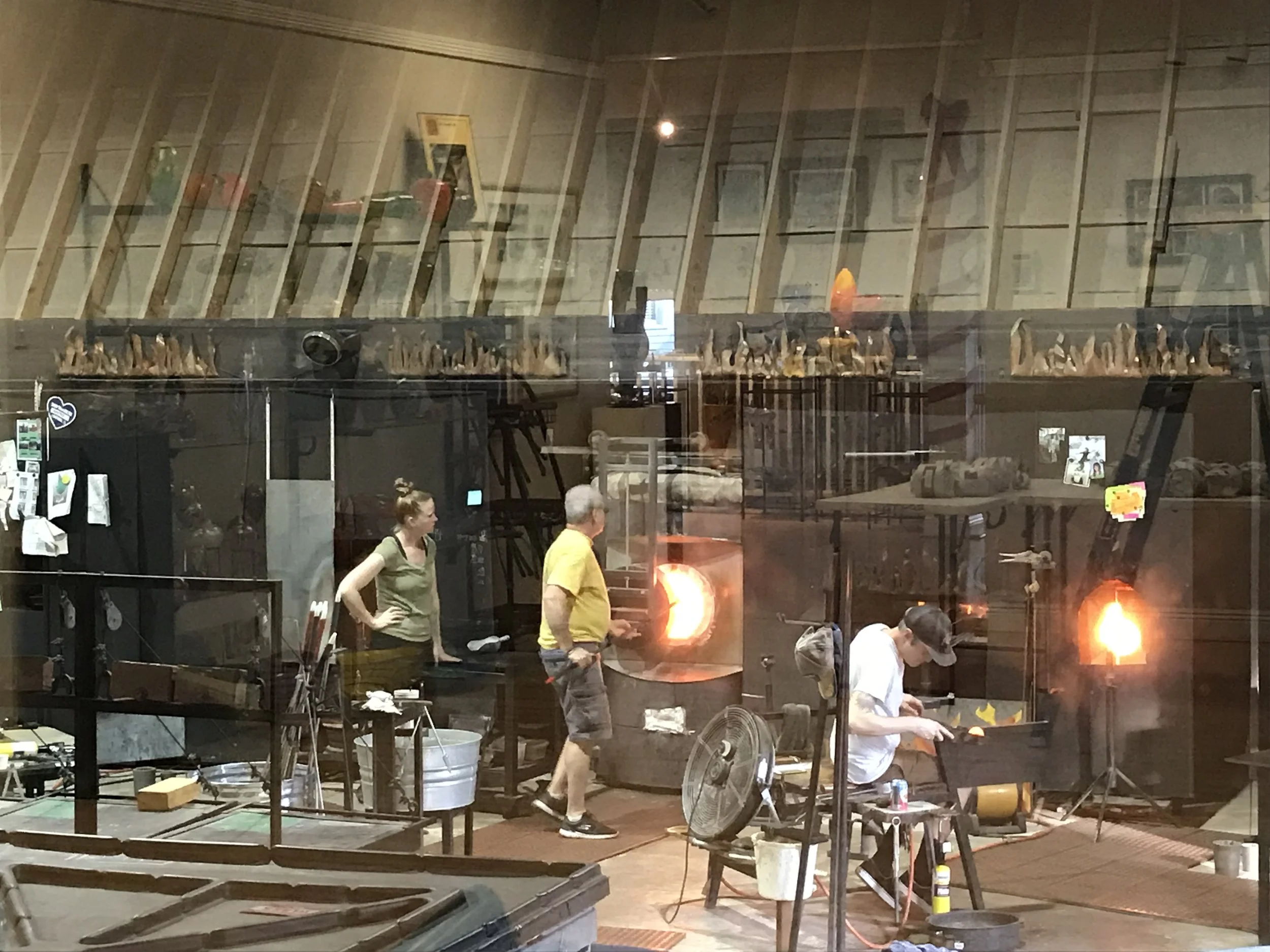 A good portion of the town’s grid is on a diagonal, so giving directions is a little awkward. We meandered east for a bit until we arrived to an old Art Deco movie house with “Rosetree Blown Glass Studio and Gallery” on its marquee. It has been transformed into a working blown glass studio. The furnaces stand where the movie screens once towered. The lobby has been converted to a gallery displaying various colorful forms. Windows divide the two parts of the building so that spectators are able to watch the glass blowers perform their skill. There is also a free, short film that you can watch upon request.